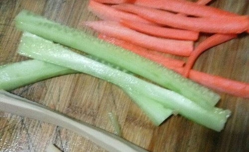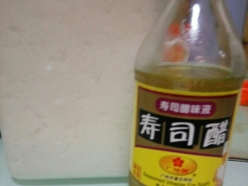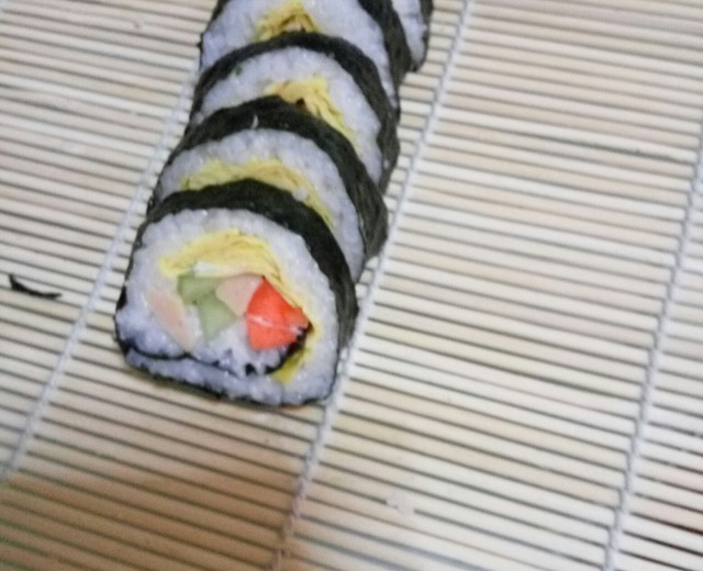 紫菜一张黄瓜半根鸡蛋一个米饭适量寿司醋一勺糖半勺火腿肠半根沙拉酱一点