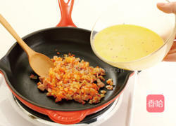 步骤2、拌炒洋葱、红萝卜、培根,再加入步骤1的蛋汁。