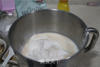 步骤1、这款菜谱的备料:金龙鱼面包用小麦粉500克,牛奶250克,鸡蛋2个,白糖50克,酵母6克,玉米油30克,盐5克,熟芝麻适量,熟核桃仁适量,蓝莓酱适量。(这个量可以做三个如图的面包)