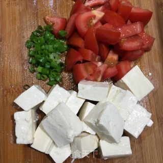 步骤1、西红柿洗净切丁,香葱切碎,豆腐切小块备用。