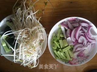 先把芹菜。豆芽 土豆用水烫熟,捞出沥干