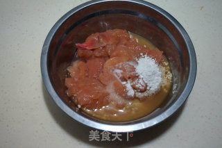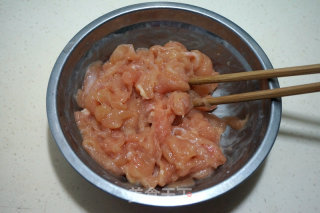步骤1、鸡胸肉切片,放一小勺淀粉,少许盐、适量料酒