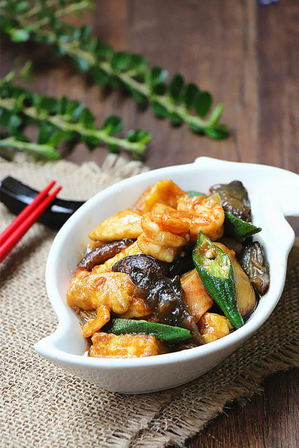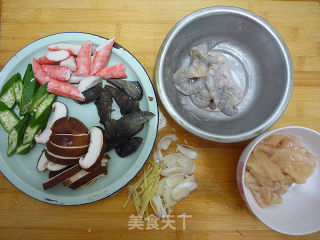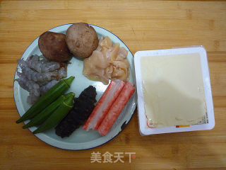步骤1、嫩豆腐、鲜虾仁、鸡肉、香菇、蟹肉棒、海参、秋葵