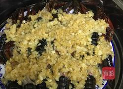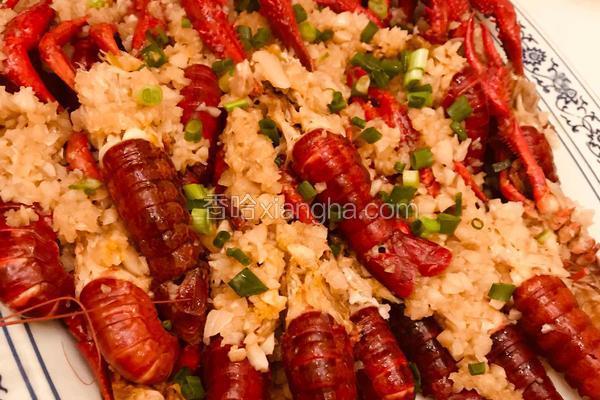 步骤2、蒜蓉汁调制方法:将蒜捣成蒜泥,然后将食用油倒入锅中熬制4成油温,倒入蒜蓉,小火慢熬制蒜香味扑鼻,倒入白糖,盐,鸡精,蚝油,搅匀后铺在小龙虾上,放入蒸锅内蒸10分钟。