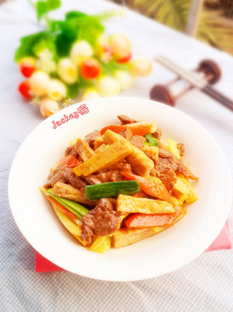 把香芋切粗条,红萝卜切象眼片,香芹,青蒜切斜刀条,牛肉切片加入姜蒜片、盐、糖、味极鲜、生粉、食用油腌制