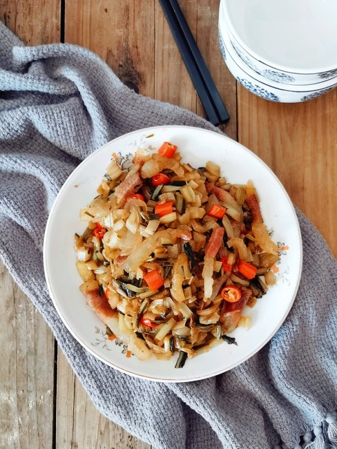 本身就是咸菜,根据自家腊肉,腌菜的咸度用料,如果本身很咸,就用冷水浸泡2小时,清洗干净控水再做菜