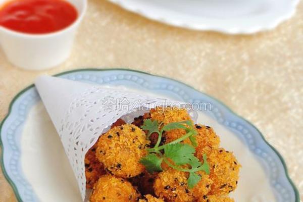 2:因为是裹面包糠的,所以丸子不适合过大(跟鸡米花一般大小即可),以免面包糠炸老了肉丸还没熟。