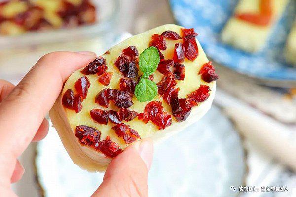 参考月龄:10个月以上,对食材不过敏的宝宝食材准备:毛豆70克、苹果40克、粘米粉50克、鸡蛋清70克、砂糖15克、柠檬半个、蔓越莓碎5克烹饪时间:35分钟难度分析:初级