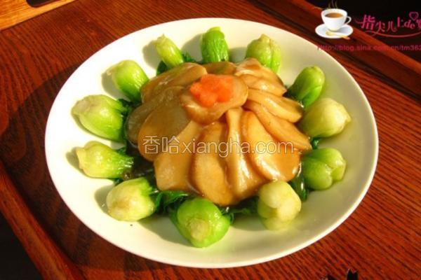 一定要先煎至表面微微有点发黄, 这是杏鲍菇吸收了油, 会有肉肉的感觉;3. 加入鲍鱼汁进一步的入味, 同时加入生抽调色, 这样杏鲍菇不仅从口感, 而且从颜色更接近鲍鱼;4. 最后加入水淀粉, 勾薄薄的一层芡汁, 淋浇在码放好的杏鲍菇表面, 这样小白菜芯也可以借味更好吃。