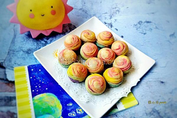 5.不喜欢带点白心心的可以在第二次擀长卷起时将白色部分切掉。变成彩虹酥啦。