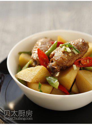 1. 鸡翅表面划几刀方便入味, 加入姜葱、料酒和盐先腌制一下; 2. 腌制好的鸡翅煎至两面金黄后再加入料酒、生抽煮上五分钟; 3. 加入土豆一起煮上十五分钟(以