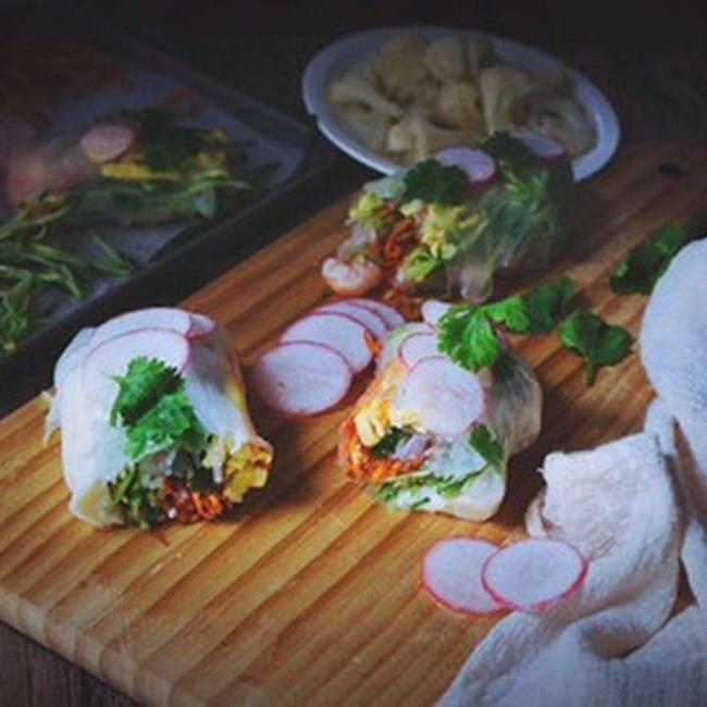 我用的皮宽是22cm,切开吃正好搭配的蔬菜没有一定之规,喜欢什么放什么,做法和酱料不同,口味也千变万化酱汁我选了甜辣味的,不能吃辣的亲们可以选花生酱+海鲜酱油+花生碎调味,花生碎没有可以省略另一款小清新风味的酸甜酱汁:柠檬汁半颗鱼露2勺白醋1勺糖2勺半水小半碗