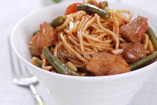 长豆角,颈背肉,鲜面条,番茄,葱姜,老抽