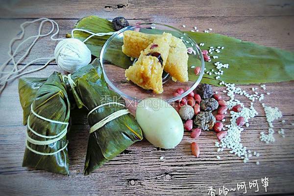7、绑粽子的时候不要绑太紧,松紧适宜,保证不散开即可,绑太紧了煮的时候容易爆开。