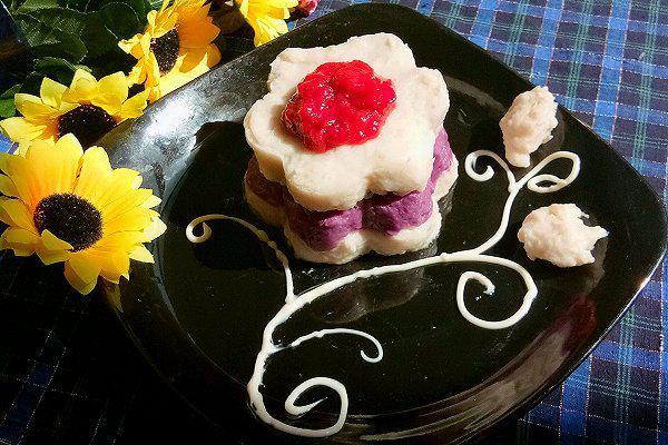 ,但是不要加太多,不然芋泥太稀了不好成型。2,夹了芋泥口感丰富了许多,如果不喜欢也可以换成豆沙或者其它果泥。3,如果没耐心用模具玩儿,就直接在碗里铺一层芋泥,再铺一层