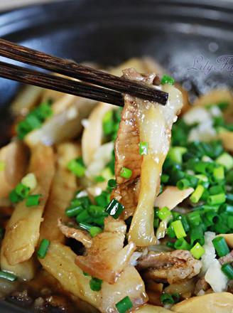 花腩切薄片放盐和五香粉抓匀腌一会,茄子切条清水泡一会沥干; 鸡肉肠切片,葱切花,蒜剁碎,辅料里的所有材料混合调匀成酱汁; 砂煲烧热后先倒点油打底; 倒入花腩翻炒;