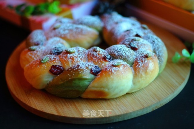 圣诞花环面包的窍门1.每款烤箱温度不同,烘烤时间根据自己的实际情况增减; 2.表面装饰的果干、坚果随自己喜好更换; 3.烘烤的时候当面团上色到自己喜欢的程度后记得表面盖上锡箔纸,阅读:71 -