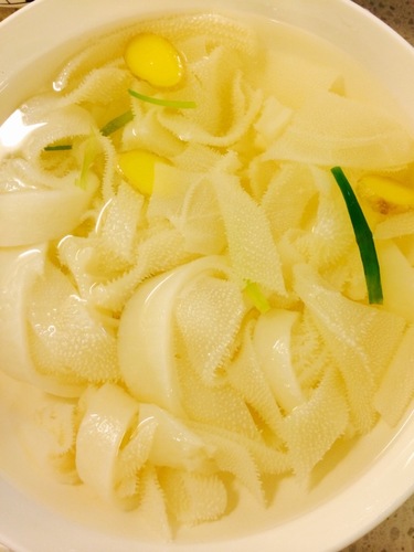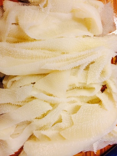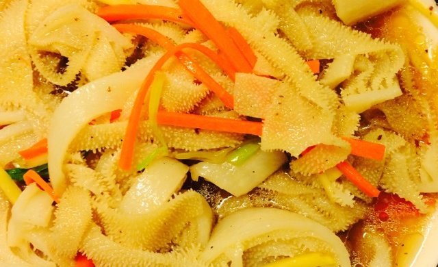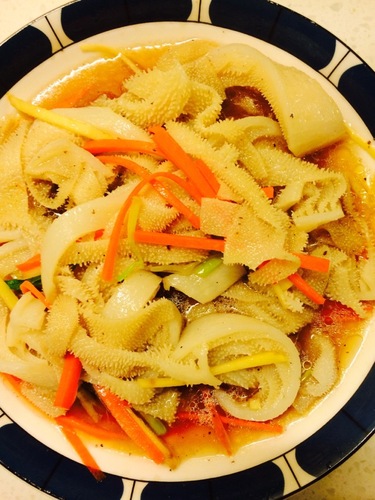 步骤1、 牛百叶洗净,切成条,家里吃可以切宽些