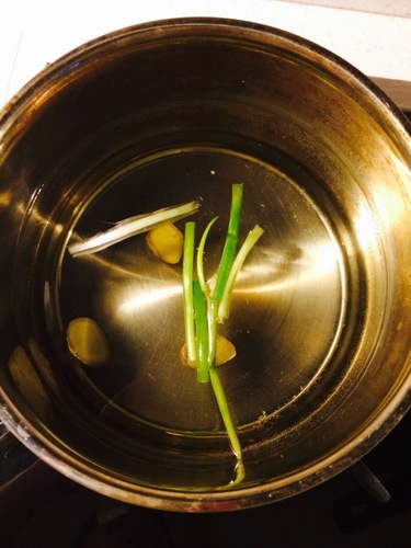 步骤2、 冷水入锅,放入姜片和葱段,将水煮开