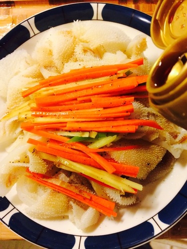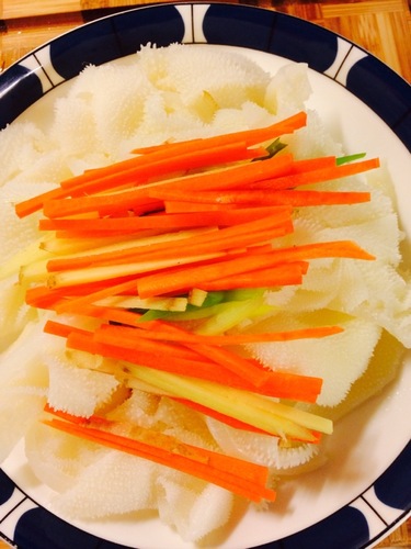 步骤5、 胡萝卜,葱,姜分别切成丝儿,放在沥干水后的牛百叶上,同时撒上少许盐和白胡椒粉