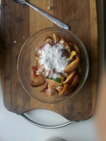 步骤2、 鸡腿去骨切块和切片的香菇用料酒,盐,耗油,老抽,淀粉,姜片,葱节腌制30分钟