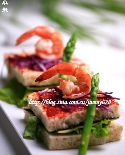 最上面一层面包片上再图上辣酱,洒上紫甘蓝丝,放上熟虾,将焯熟的芦笋放在三文治旁即可