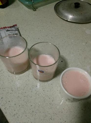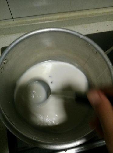 步骤3、 放入牛奶和糖(根据个人喜好添加。)慢慢的,不停的搅拌。不可以停。QQ糖会粘在锅底。