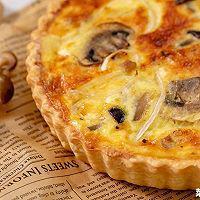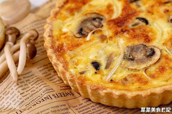 步骤13、 派皮小孔用面粉填补,铺上洋葱丝、鸡腿肉、蘑菇、奶酪碎,再倒入蛋奶水,表面撒点洋葱、鸡肉蘑菇装饰
