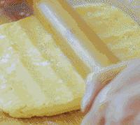 步骤4、 揉面板撒粉防粘,把冷藏过的面团铺在上面,擀成一个能完全盖住派盘的大圆片