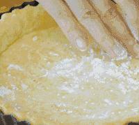 步骤5、 用擀面棍转移派皮,盖在派盘上,派皮贴着内侧整型