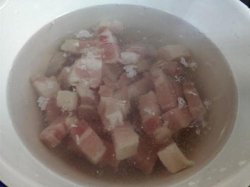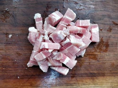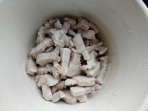 步骤1、将冻得稍硬的五花肉切手指粗的条。