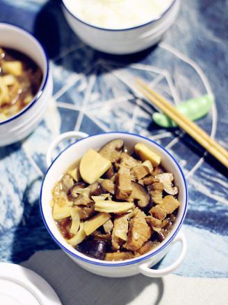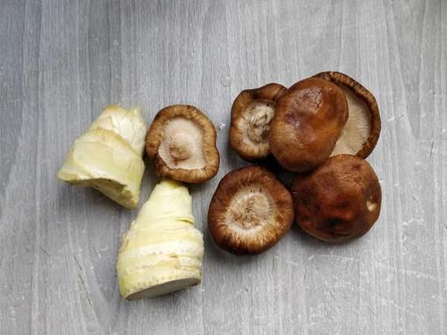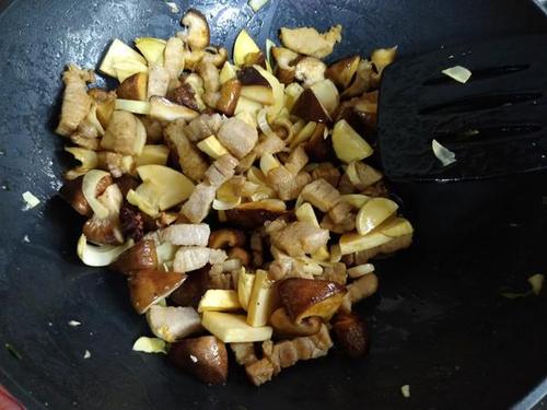 步骤9、倒入冬笋、香菇、盐、料酒、生抽翻炒均匀。