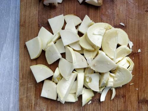 步骤6、冬笋也切成厚片,在沸水中焯一下,沥净备用。