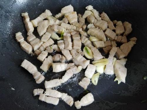 步骤8、下五花肉,小火煸炒到出现焦痕的程度。