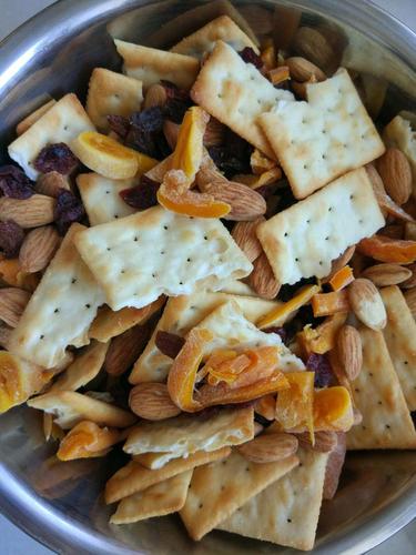 步骤1、 把所有的坚果、果仁和饼干放在一起,我的饼干块比较大,所以掰开了。这里的果仁和果干可以根据自己的口味添加,不一定非要和我一样的。在强调一下,饼干不要用酥性的,最好买硬质的饼干。