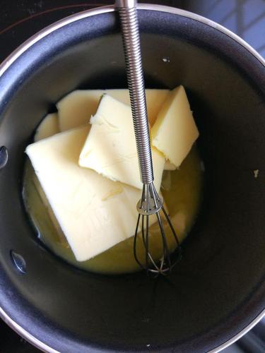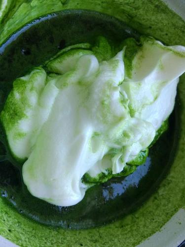 步骤7、 糖水煮到125度的时候,把黄油和抹茶的部分加入水怡中,用电动打蛋器中高速搅拌均匀。