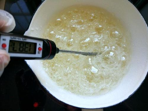 步骤5、 水怡、细砂糖、水放入奶锅中小火持续加热,用温度计测试温度,糖水煮到120度开始打发蛋白。 温度计测量的方法:探针悬在气泡中,不要插入锅子底部,这样测出来的温度是锅子底部的温度,不准的。