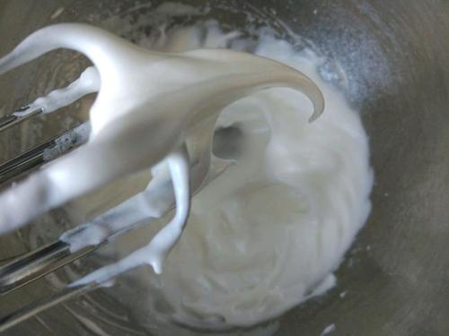 步骤6、 糖水煮到110度的时候打发蛋白,蛋白打发到中性发泡状态。