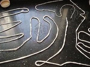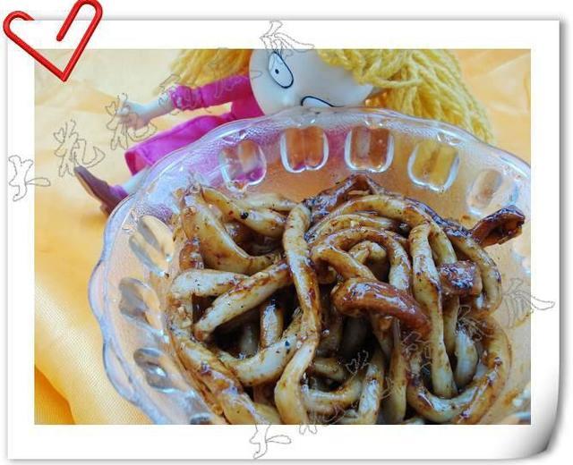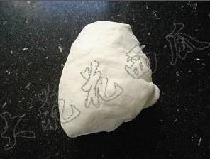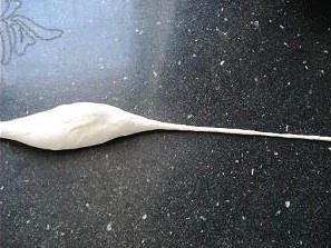 步骤2、捏住面团一角开始搓成筷子精细的面条(我开始搓得太细,后来觉得不好就搓粗了一些),由于我做的是长寿面,所以要不断哦,一直慢慢搓下去,直到搓完面团