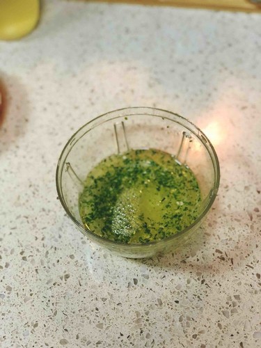 步骤1、一根小葱和一片姜加入水,放入料理机搅碎,然后过滤备用