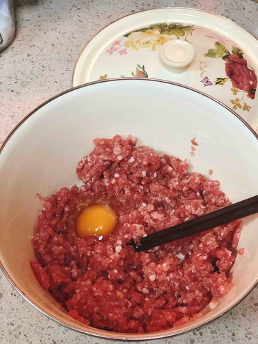 步骤2、猪肉馅里面打一个鸡蛋,充分搅匀