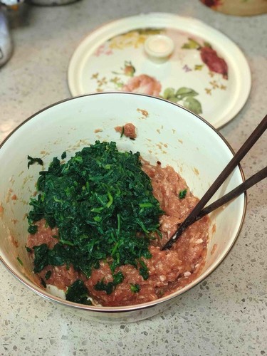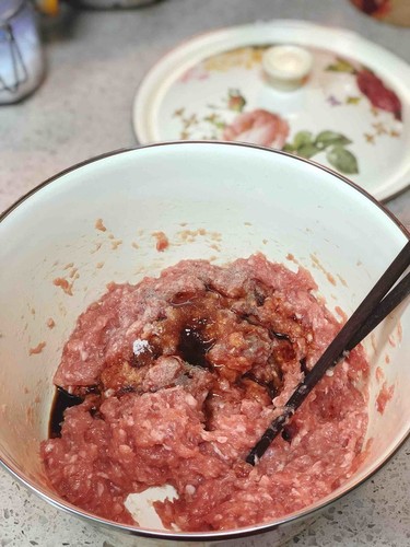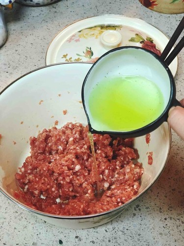 步骤3、然后把过滤好的葱姜水倒进来,边倒边搅,让肉馅充分吸收水分搅上劲儿,上劲儿的检查办法:筷子插在上面不倒,或者肉馅已经不再吸收水分了。这样的肉馅煮出来才不柴,特别好吃