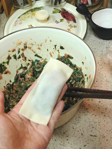 步骤10、馄饨皮买的先成的,也可以自己和面擀。把馅放在中间,皮的四周抹点水