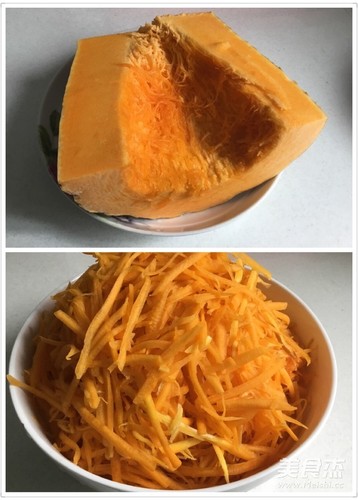 步骤1、南瓜洗净去籽,用擦丝器擦成细丝,倒入适量的食用油,盐,胡椒粉搅拌均匀待用。