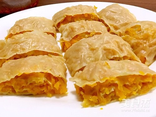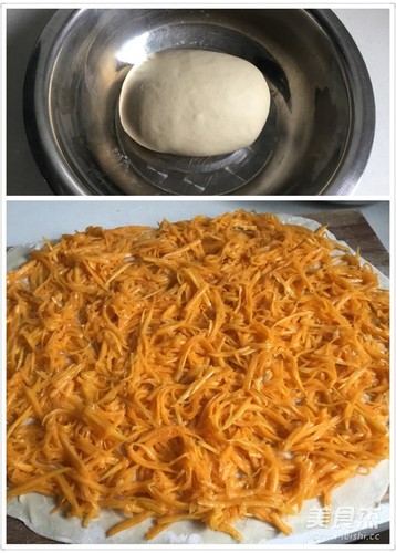 步骤2、凉水和面 醒20分钟,用擀杖把面团擀成薄面皮,调味好的南瓜丝均匀的放在面皮上