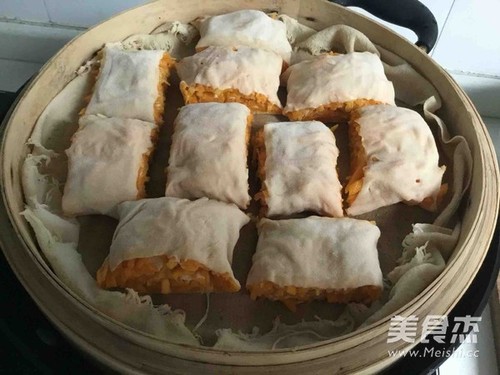 步骤4、成型的菜卷放入锅中,大火上汽后转中火10分钟即可