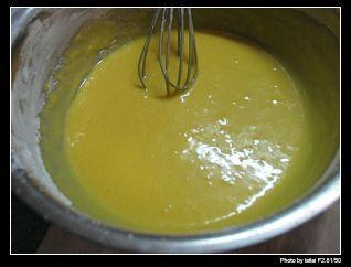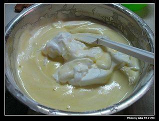 步骤4、蛋黄糊和打发的蛋清搅拌在一起,要把打发的蛋清分三次搅拌