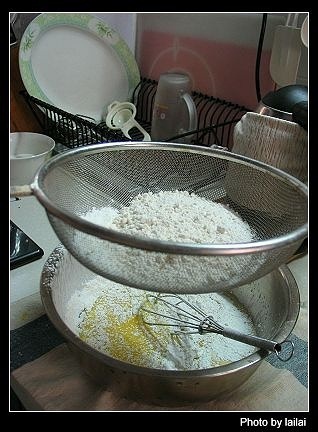 步骤3、蛋黄糊的做法:把蛋黄和另外60克白糖搅拌,再加入50克色拉油,50克牛奶,搅拌均匀,然后让面粉过筛,过筛后充分搅拌,做成蛋黄糊