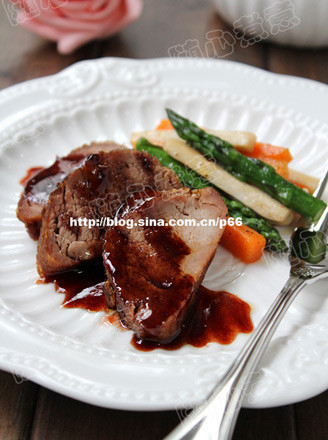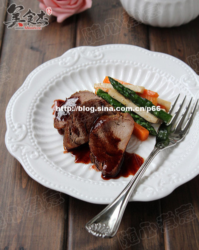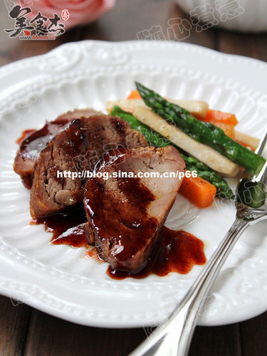 将烤好的猪里脊肉切成1.5厘米厚的圆片放入盘中,将炒好的蔬菜条搭配在旁边,最后将酱汁淋在肉片上即可