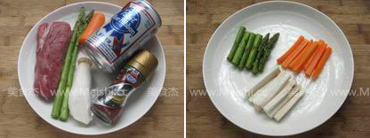 胡萝卜、芦笋和杏鲍菇洗净后切成粗细相同的条状